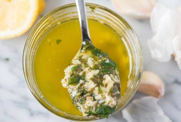 - Смешать сок лимона с растительным маслом, чесноком, майораном.