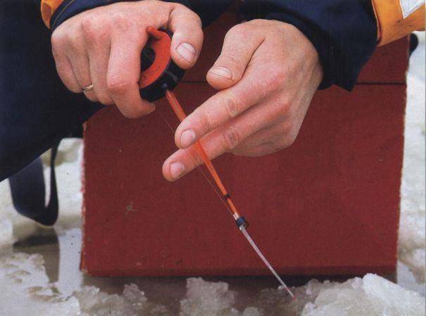 Зимняя поплавочная удочка может обеспечить улов даже в глухозимье, особенно если прикормить подходящую лунку. Подсечку рыбы делает только удилище, вываживается особ леской, которую перебирают руками.