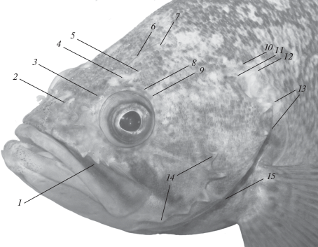 Расположение шипов на голове темного окуня Sebastes schlegelii, пойманного в районе Балаклавы (Чёрное море): 1 – лакримальные, 2 – носовые, 3 – предглазничные, 4 – заглазничные, 5 – тимпанальные, 6 – затылочные, 7 – нухальные, 8 – сфенотикальные, 9 – посторбитальные, 10 – верхние посттемпоральные, 11 – нижние посттемпоральные, 12 – супраклейтральные, 13 – оперкулярные, 14 – преоперкулярные, 15 – субоперкулярные.