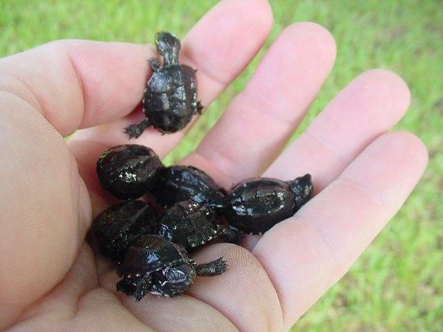 За несколько дней до этого она много ест и ищет себе место под искусственным солнцем, лучше, ультрафиолетовой лампой. В период с мая по август самка может откладывать яйца несколько раз, в каждой кладке их может быть 2-3. Закончив процесс, «мама» не ухаживает за своими детьми, а уходит обратно в водоем. Вылупившиеся через 2-3 месяца черепашата могут сидеть в своем убежище всю зиму, питаясь содержимым желточного мешка. Но это в природе. Для аквариума могут быть сделаны исключения. Малыши гораздо быстрее приобретают самостоятельность, поскольку погодные условия не оказывают влияния на параметры микроклимата в аквариуме.