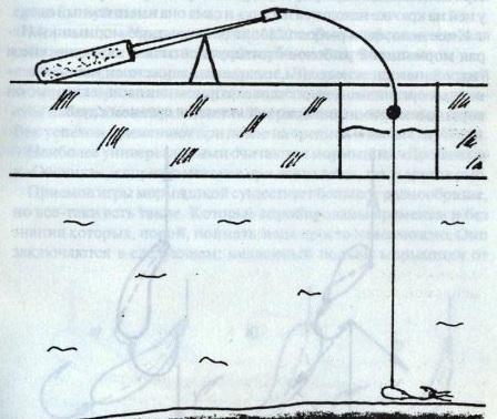 Эта снасть, по сути, повторяет поплавочную ловлю, только применяется при этом мормышка и кивок. Настраивается она так, чтобы приманка едва касалась дна, а сторожок при этом был изогнут под углом в 45 градусов.