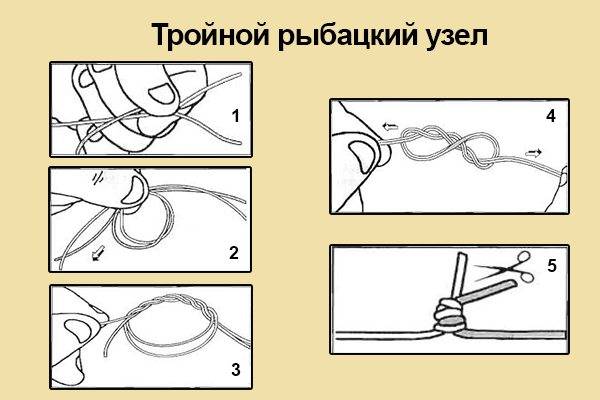 Здесь важно, чтобы материал был примерно одинаковым по толщине – иначе надежность подобного крепления всерьез пострадает. Если же все-таки приходится соединять две разные по диаметру в поперечнике снасти, самую тонкую из них стоит сложить именно в месте связывания вдвое