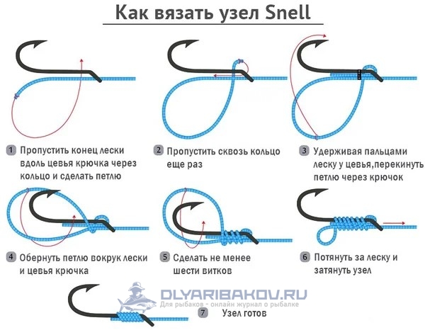 Для того чтобы привязать леску к крючку с помощью узла Snell, проделайте следующие действия: