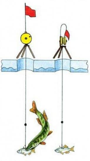 - Бурятся 3 – 5 лунок, на которые устанавливаются жерлицы, после чего каждая снасть проверяется на поклёвки в течение всей рыбалки (ждём, когда хищник придёт сам);