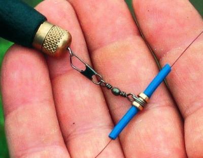 - На конец основной лески привязывается тройной т-образный вертлюжок к верхней планке буквы т.