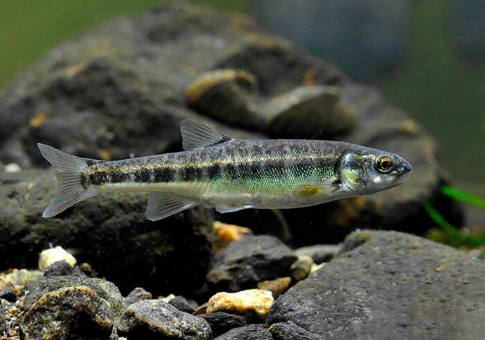 Phoxinus phoxinus — научное название наиболее распространенного подвида гольяна. Остальные названия рыба получила за пеструю окраску. «Красавица» или «Скоморох» интуитивно понятны нам даже без перевода с разных диалектов. Спина у всех гольянов темно-зеленая. Отраженный солнечный свет может иметь голубоватый оттенок. Посередине есть черная полоса. На золотистых боках рыбы видны темные пятна. В области спины эти включения настолько плотные, что превращаются в сплошной цвет. Ближе к животу пятна почти полностью исчезают.
