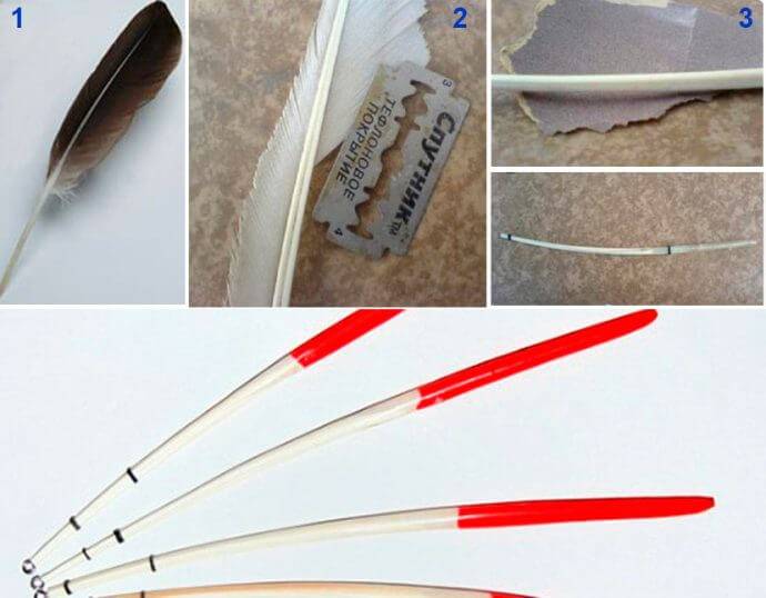 Сделать такой поплавок самостоятельно очень просто, вам нужно лишь очистить перо от пуха и он почти готов. Если требуется, то можно немного укоротить само перо лезвием, это тоже достаточно просто. Единственное что нужно помнить это аккуратно очищать лишний пух, дабы не нарушить герметичность пера