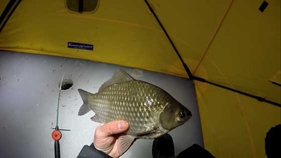В течение зимы карась не проявляет высокой пищевой активности, однако в период длительных оттепелей его можно поймать как днём, так и в ночные часы. Если для рыбалки в светлое время суток чаще применяют мормышечную снасть, то по темноте лучше работает зимняя поплавочная удочка с грузилом и крючком.