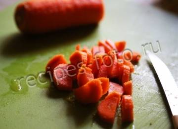 Затем чистим морковь и нарезаем ее полукружиями, мелкую можно нарезать кружочками.