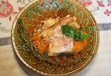Морской окунь имеет тонкую кожу, которую легко повредить во время готовки. Если обжаривать его на сковороде, то рыба гарантированно ее лишится. Чтобы этого не произошло, готовить его будем на овощной подушке.