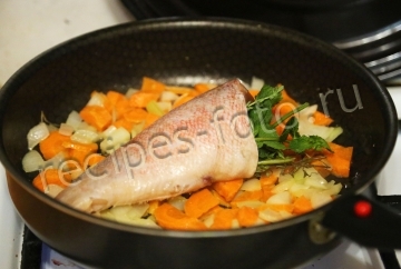 Ароматные травы и овощи выкладываются вокруг рыбы.