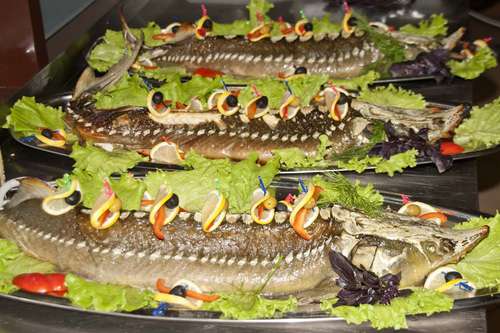 - Украшение рыбы занимает особое место в рецепте. Очень выразительно смотрится рыба на подушке из листьев салата. Особый «царский» вид блюду придаст красная или черная икра. Её можно выложить на голову рыбы или уложить рядом. Около осетра положите веточку винограда и разбросайте хаотично зерна граната. Можете проявить свои творческие способности и украсить блюдо на ваше усмотрение.