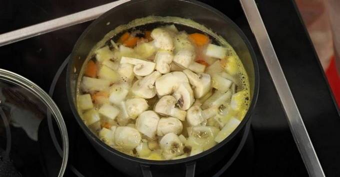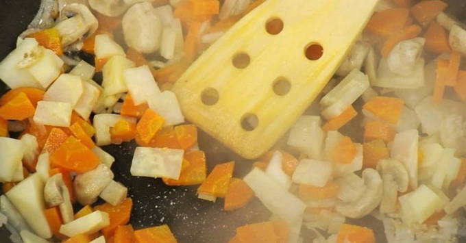 Шаг 2. Корень сельдерея и морковку сполосните, почистите от кожуры, разрежьте на удобные части. Шампиньоны почистите от шкурки, обновите срез на грибной ножке. Разрежьте на части. Подготовленные составляющие сложите в кастрюлю и припустите в подсоленной воде.