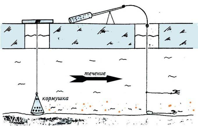 Для помещения прикормки зимней на плотву в перспективное место ловли, целесообразно задействовать качественную кормушку. В качестве примера можно взять популярную конструкцию с народным названием «самосвал». Она работает по простому принципу, который заключается в опускании емкости с составом на глубину с помощью лески. Как только леска заканчивается, это провоцирует открытие приспособления, в результате чего смесь опускается на дно. Задача этой кормушки заключается в том, чтобы привлечь рыбу к конкретной точке ловли.