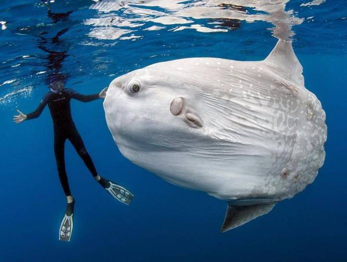 Самая большая из костных рыб в мире считается рыба-луна. У нее есть еще ряд названий: рыба-голова и рыба-солнце. Средняя длина 3 метра, но имеются сведения об экземпляре в 4,2 метра и 2,2 тонны. За счет того, что скелет содержит много хрящевой ткани эти рыбы достигают больших размеров. Тело луны напоминает диск, длина которого равна ширине. Зубы срослись в форме клюва, который не дает полностью прикрывать рот. Есть версия, что луна за счет глоточных зубов, может издавать скрежущие звуки. Её кожа имеет голубоватый цвет и лишена чешуи. Это не только самая большая, но и самая плодовитая рыба. За один раз самка приносит около 300 миллионов икринок. Рыба-солнце обитает во всех океанах, предпочитая большую часть времени проводить на глубине до 200 метров. Оптимальная температура воды должна быть около 10ºС. Пребывание в более теплой воде может вызвать гибель луны.