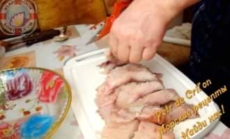 - Очищаем 2-3 тушки от черной пленки и плавников. Если есть необходимость, удаляем голову и хвост. Нарезаем рыбу порционными кусочками и складываем в миску.