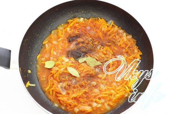 - Через 10 минут в тушеную морковь выливаем стакан рыбного бульона, 1 лист лаврушки, 2 бутончика гвоздики, черный перец горошком — 8 шт., 1 ст. ложку сахара, 1 ч. ложку соли, 2 ст. ложки яблочного уксуса.