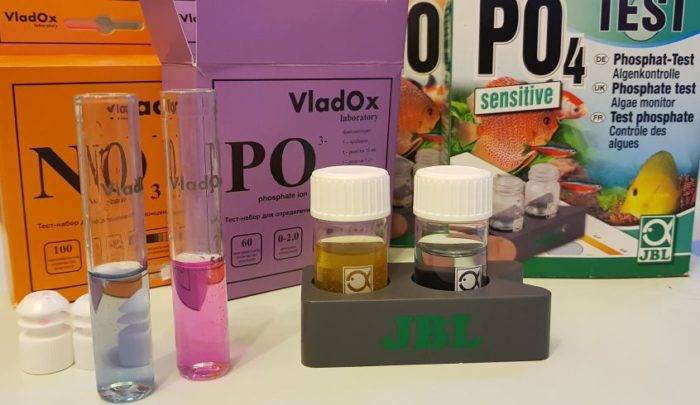 Самое главное – в воде не должно быть повышенной концентрации фосфатов и азотистых соединений. У каждого опытного аквариумиста должен быть под рукой набор капельных тестов (как минимум, на фосфат и нитрат). Сегодня такие тесты стоят недорого, трудностей с ассортиментом или покупкой нет. Это могут быть, к примеру, популярные капельные тесты UHE, которые можно приобрести только онлайн. В оффлайн-магазинах продаются недорогие тесты Vladox.