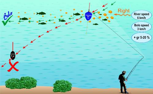 Основным предназначением болонской удочки является ловля в проводку на течении. Существует три вида проводки.