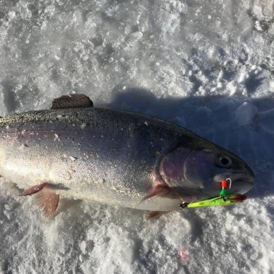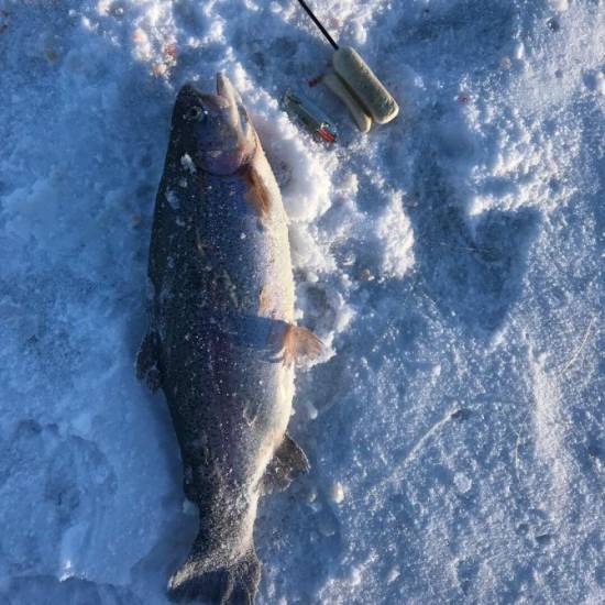 На следующей лунке получаю мощнейшую поклёвку, но рыба сошла из-за того, что свободный крючок тройника зацепился за кромку льда. Ещё несколько лунок результата не принесли, да и уже пора бы и на запуск идти. На запуске главное определить горизонт, в котором расходится рыба. В разных частях вокруг ленточки начинаются поимки, но только не у нас. Первая поклёвка у меня произошла примерно через час после начала запуска. Рыба в основном ловилась в 1,5-2 м ото льда. Ещё пару часов я уделил ловле около ленточки. За это время удалось поймать 8 форелей. Ловил всё на ту же блесну Williams Wabler 40 в цвете Н.