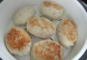 5. В режиме жарки прогреваем немного масла и обжариваем котлеты из трески до готовности – нежного золотистого окрашивания с обеих сторон.