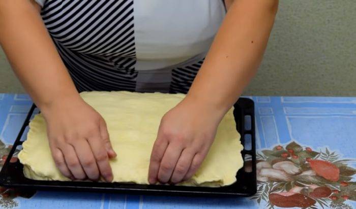 - Разделить пополам тесто. Каждую часть раскатать в пласт. Одну из них поместить на противень.