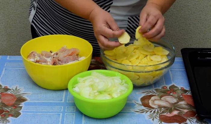 - Очищенную от кожуры картошку тоже порезать на слайсы или просто кружочки.