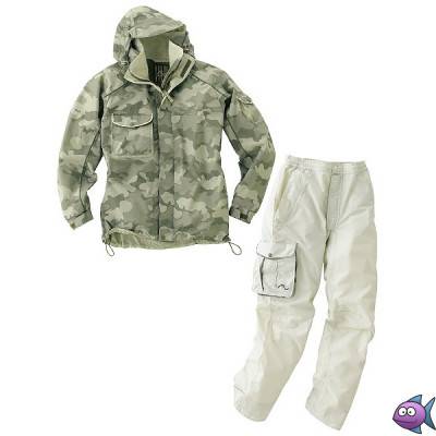 Летний рыболовный костюм от известного японского производителя. В его комплект входят штаны и куртка, изготовленные из мембраны. Костюм обладает легким весом, практичный, многофункциональный, но стоит дорого. В поясе, на рукавах и понизу штанов имеются кнопки, благодаря которым можно регулировать степень свободы при передвижении. Кроме этого, костюм комплектуется отстегивающим капюшоном и сеточной подкладкой. Он не промокает под дождем.