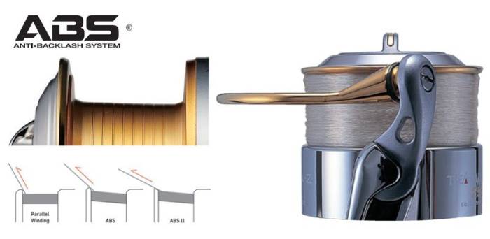 - ABS Spool — Anti-Backlash System, дословно — противоскользящая система. Шпуля ABS представляет собой шпулю в виде обратного конуса. Шпуля ABS вмещает больше лески, имеет увеличенную рабочую зону, лучше фиксирует леску при намотке лески под бортик, имеет больший внутренний диаметр, что позволяет использовать тормозные диски фрикционного тормоза большего диаметра. Шпуля ABS обеспечивает увеличение дальности заброса, облегчает сход лески со шпули, позволяет увеличить нагрузку на фрикцион и увеличить скорость его работы.