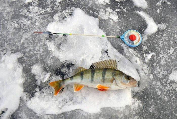 Окуня очень успешно ловят на безмотылку. В качестве приманок используют приманки с одним крючком (уралка, муравей и др.), а также чертики, козы и ведьмы. Играть мормышкой следует очень активно.