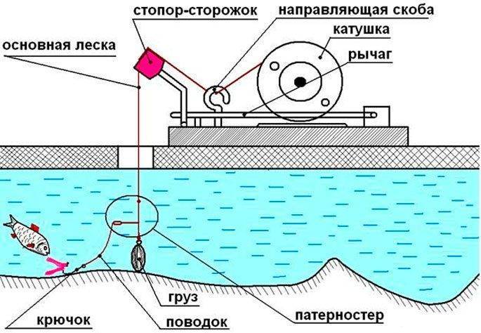 Принцип работы этого устройства сходен с зимней жерлицей. Разница состоит лишь в том, что «выстрел» осуществляется не флажком, а хлыстиком бланка.