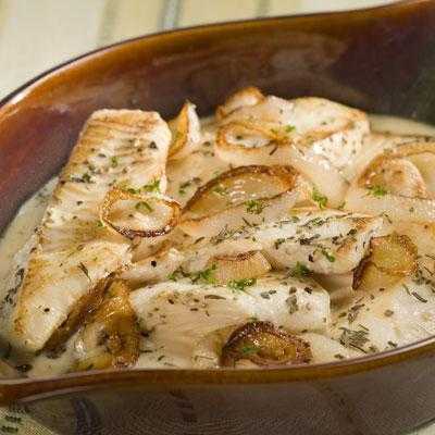 - Луковицу очистите, нашинкуйте кольцами, добавьте в блюдо. 0.5 литра овощного бульона смешайте с 200 мл сметаны и залейте этим рыбу так, чтобы она была вся им покрыта.