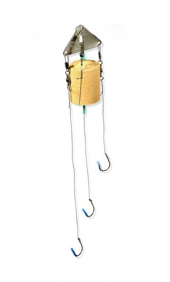 Принцип действия такого рода приманки очень прост, но одновременно гениален. На снасти имеется несколько крючков, которые подвешиваются параллельно друг к другу. Когда вещество начинает работать, выделяя облако планктона, рыба начинает поедать наживку, одновременно проглатывая эти крючки.