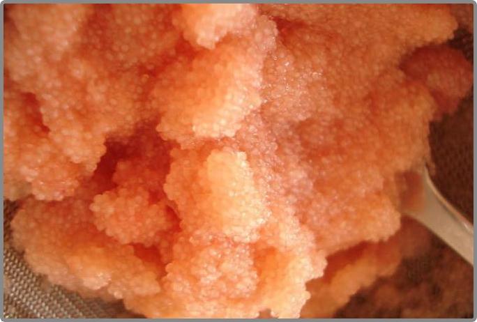 - После того, как икра разморожена, можно приступать к процессу очистки икринок от пленок, когда это сделано, можно приступать к засолке.