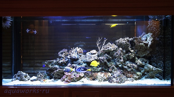 Для этого вместо стандартной крышки над аквариумом устраивается ромбовидный или прямоугольный светильник, обеспечивающий освещение с яркостью в 10 000 Лм и мощностью в 120 Вт. Такого светильника вполне хватает для аквариума с объемом в 200-300 литров