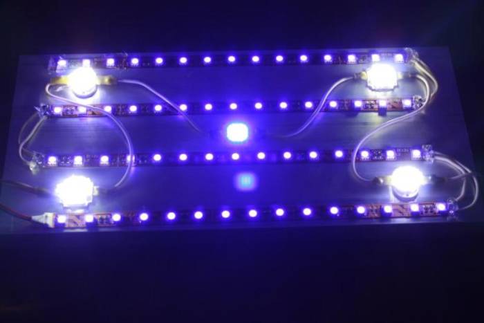 Технические характеристики такого светильника ничем не будут уступать уже готовым фабричным, но стоимость их будет намного ниже. Для сборки потребуется около 40 ЛЕД ламп по 3 Вт каждая, цвет – белый, голубой, красный, с зеленым надо быть осторожнее, так как он может провоцировать ускоренный рост водорослей. Исключить зеленые диоды совсем будет неправильно, но требуется постоянный контроль баланса, чтобы исключить рост неблагоприятной среды.