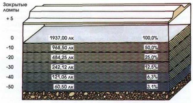 Как известно, проходя через толщу воды, свет значительно теряет свою яркость. Принято считать, что каждые 10 см отнимают 50% его яркости. То есть, если на поверхности освещенность составляет 2000 Лк, на глубине 50 см уже будет чуть больше 60 Лм. Эта ситуация наглядно продемонстрирована на следующем рисунке. Потому чем выше резервуар, тем более яркое должно быть освещение.