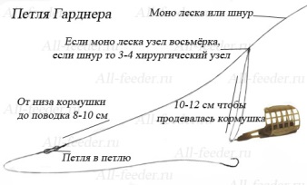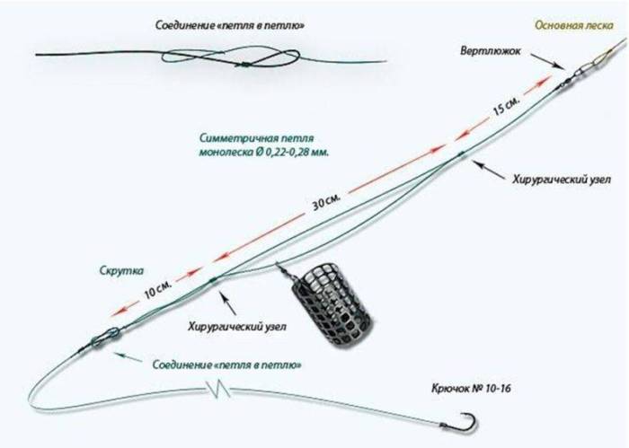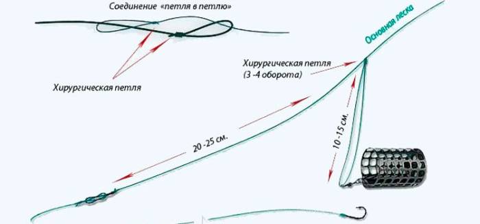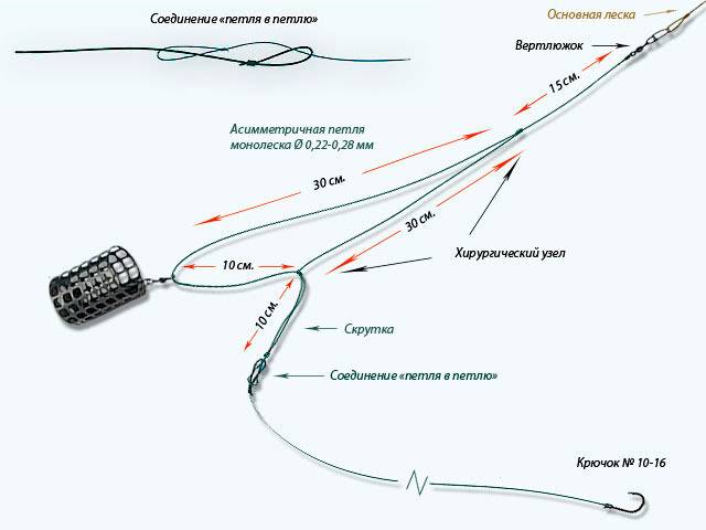 Этот вид оснастки относится к самоподсекающимся и хорошо подходит для лова рыбы на илистом дне. Даже, если часть кормушки утонет в иле, тонкая оснастка позволяет чувствительно реагировать на поклевки. Кормушка на основной леске крепится с помощью 15-ти сантиметровой петли, которая позволяет не перехлестываться с поводком. Она предназначена для лова не крупной рыбы. Для того, чтобы связать такую оснастку нужно иметь: