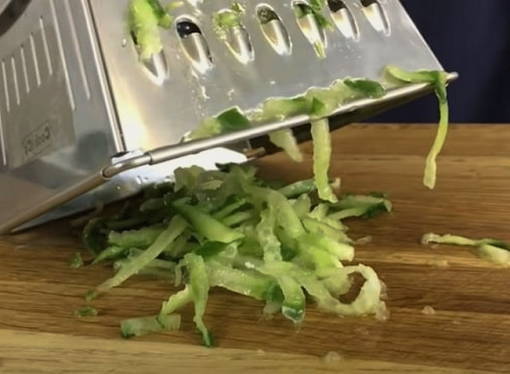 Шаг 4. Огурцы промываются, обсушиваются салфеткой и измельчаются на крупной терке.
