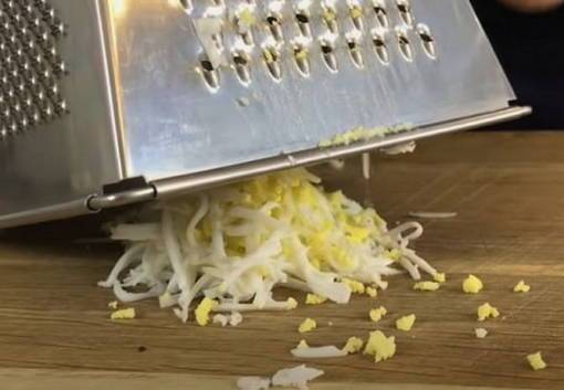 Шаг 1. Заранее отваренные вкрутую яйца и остуженные в холодной воде, очищаются от скорлупы и измельчаются на средней терке.