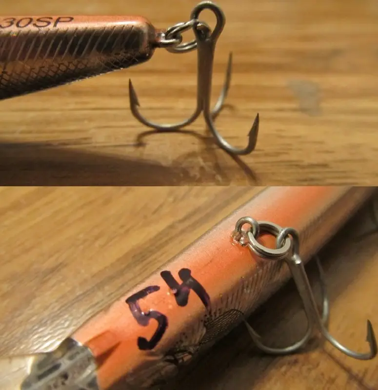 Следует обратить внимание на то, что на воблере установлены тройники, не соответствующие его размеру. Чтобы устранить этот недостаток, тройники следует заменить на более мощные
