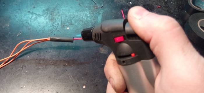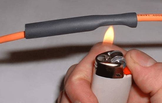 Третий вариант — использовать источники огня. Это могут быть спички или зажигалка. Держите пламя в паре сантиметров от термоусадки, чтобы ее не повредить, быстрыми и короткими движениями пройдитесь со всех сторон чтобы достичь равномерного стягивания изолирующего слоя. Для быстрого эффекта можно делать это непосредственно пламенем, тогда движения должны быть еще быстрее, а вы внимательнее. Недостатком этого способа является то, что на кембрике могут оставаться следы гари. Турбо-зажигалки лишены этого недостатка, но температура пламени очень высокая и легко сжечь трубку, поэтому держите струю пламени подальше, чтобы на нее попадали только потоки горячего воздуха.