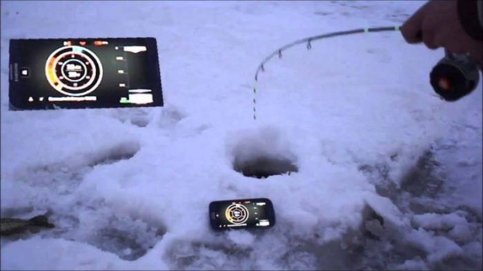 Также эхолот возможно использовать в старой, замёрзшей лунке, если на поверхности есть хоть несколько миллиметров воды. В этом случае достаточно опустить датчик на лёд, и всё, что находится под лункой, будет прекрасно отображаться.
