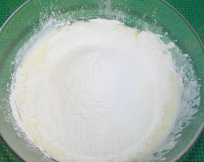 2. Добавьте гашеную пищевую соду, просейте муку и сделайте тесто тонким, как сметана.