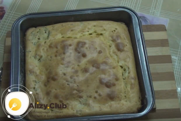 Когда пирог немного остынет, его можно будет переложить на блюдо, а затем разрезать на порционные кусочки.