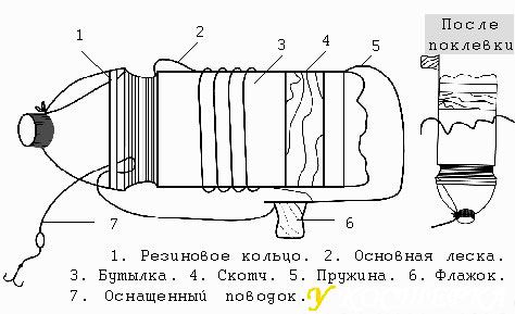 В бутылку не должна просачиваться вода. Место закручивания крышки залейте водостойким клеем или накрутите на резьбу кусочек бинта. Каждые 60-80 минут проверяйте снаряжение, в случае даже минимального протекания жерлица полностью уйдёт под воду.
